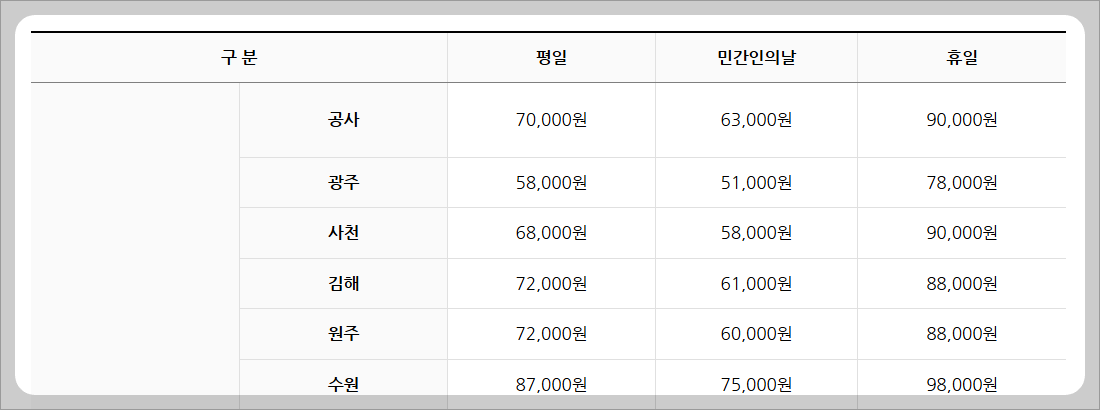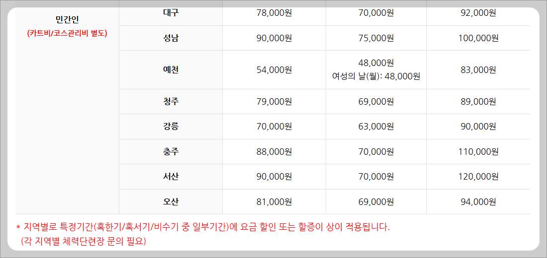 | 헬스장 (월 정기권) | 30,000원 | 40,000원 | 50,000원 |