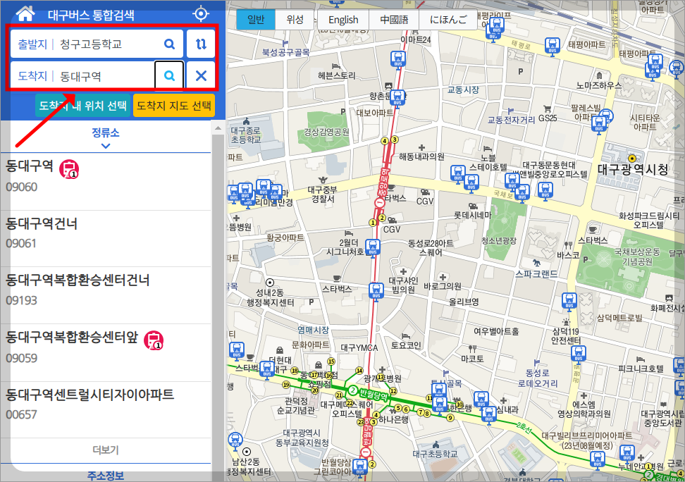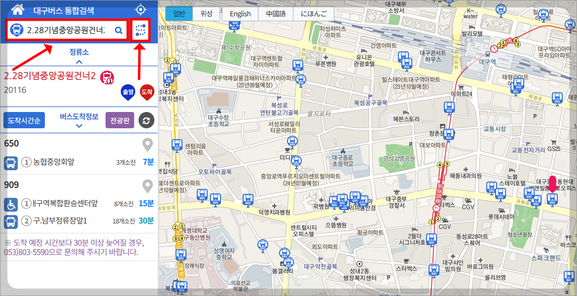 3. 대구버스 통합검색 화면에서 왼쪽 상단의 검색창에 정류소를 검색하거나, 검색하고자 하는 버스노선 번호를 입력해서 실시간 버스 정보를 알 수 있습니다.