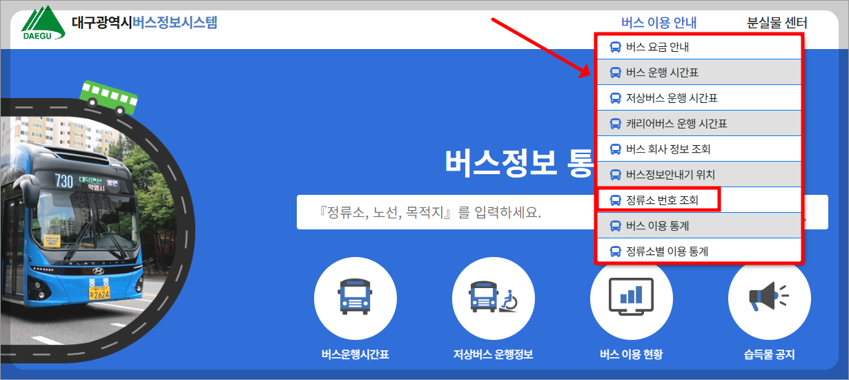 2. '버스이용안내' 아래 항목 중 '정류소 번호 조회'를 누르면 대구버스통합 검색 창이 나타납니다.