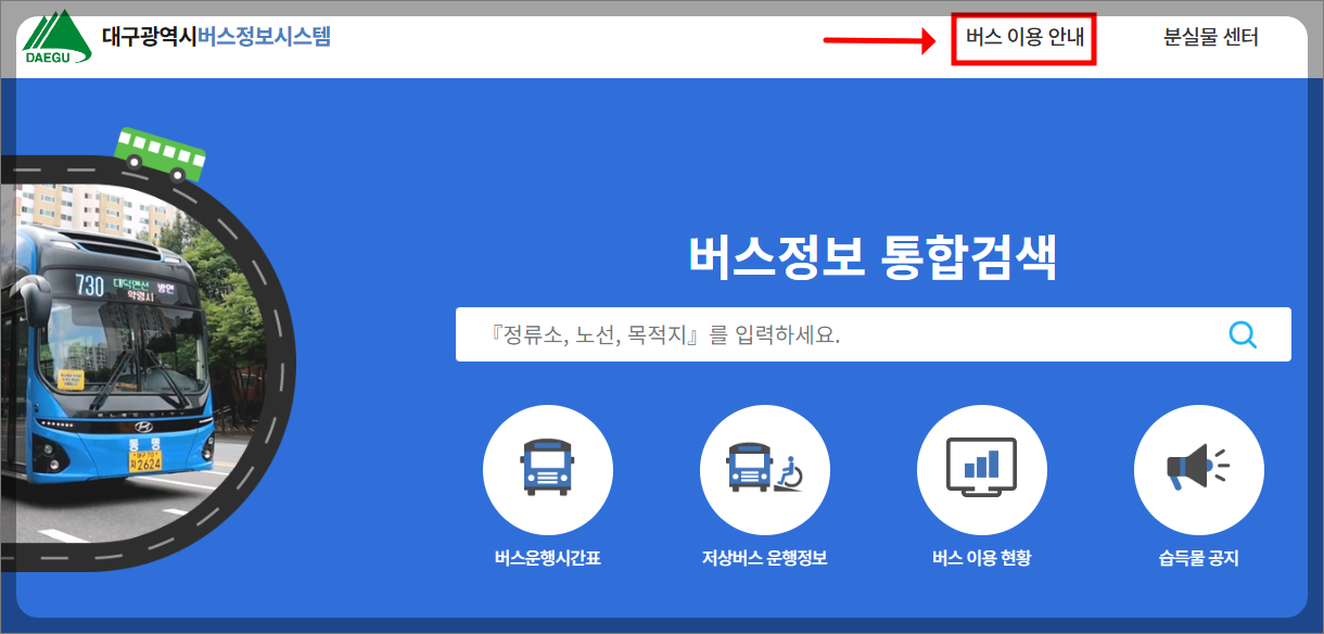 1. 대구광역시 버스정보시스템 홈페이지 메인 화면에서 '버스이용안내'를 눌러 줍니다.