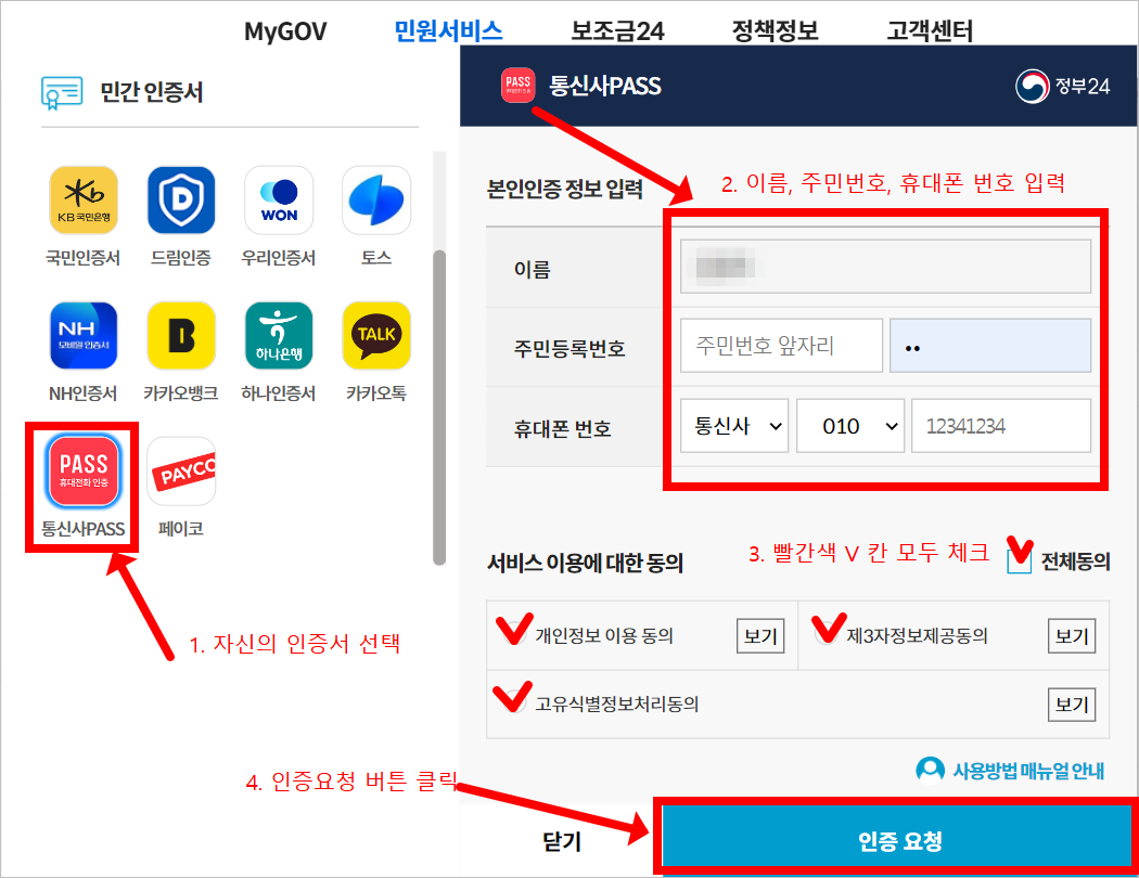 9. 이제 민간인증서를 선택하라는 창이 뜹니다. 금융인증서일 수도 있고, 저처럼 PASS인증서 일수도 있겠죠. 먼저 자신의 인증서를 선택하고 개인정보(이름, 주민번호, 휴대전하 번호)를 입력해 줍니다. 개인정보 입력을 마쳤으면 '서비스이용에 대한 동의' 전체동의를 체크해 주신 뒤 '인증요청' 버튼을 눌러 줍니다.