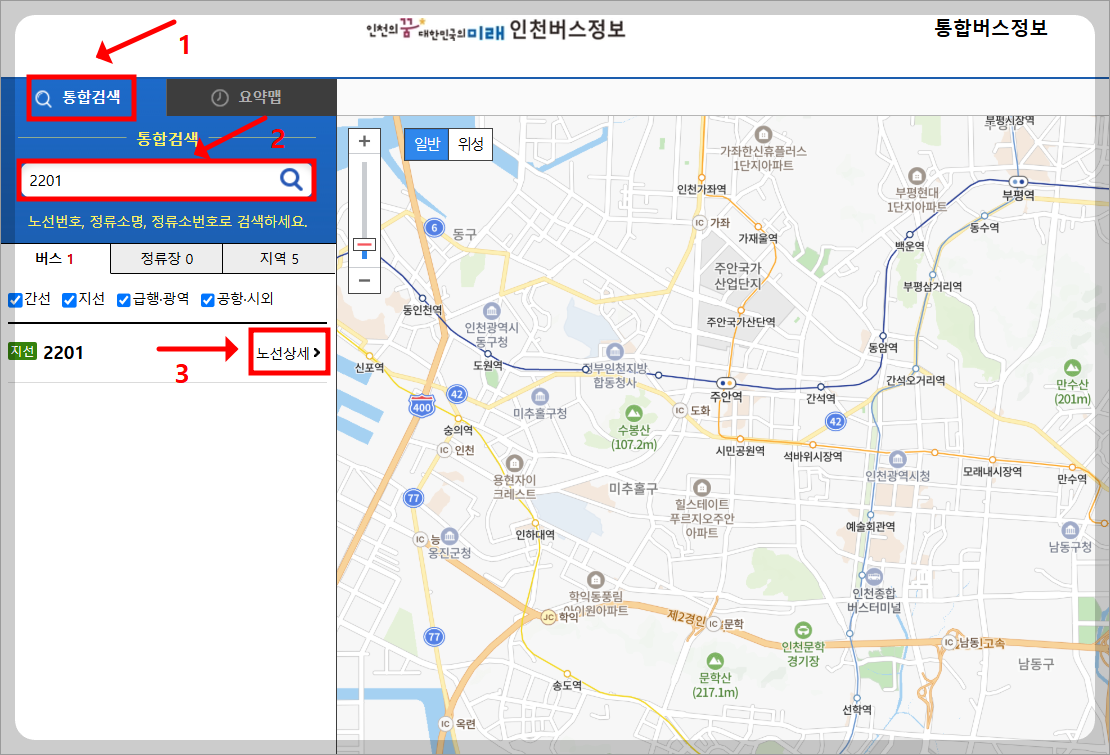 인천버스정보 홈페이지👆 버스정보 검색 안내 - 통합검색과 요약맵
