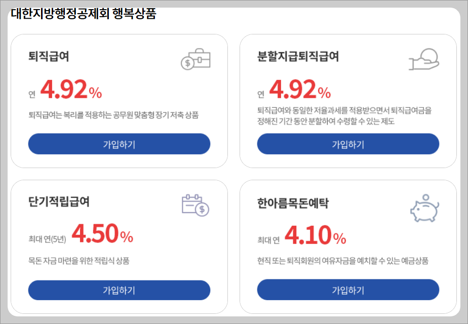 이 외에도 한아름목돈예탁, 단기적립급여 등의 특별 상품에 대한 정보와 가입 신청도 홈페이지를 통해 이루어집니다. 또한, 각종 증명서 발급과 개인정보 관리도 홈페이지에서 편리하게 할 수 있습니다.