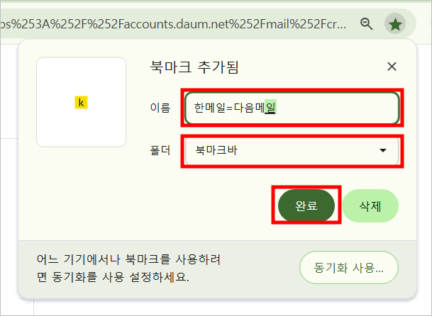 - 한메일넷 페이지를 열고 브라우저의 '북마크 추가' 기능을 사용합니다.